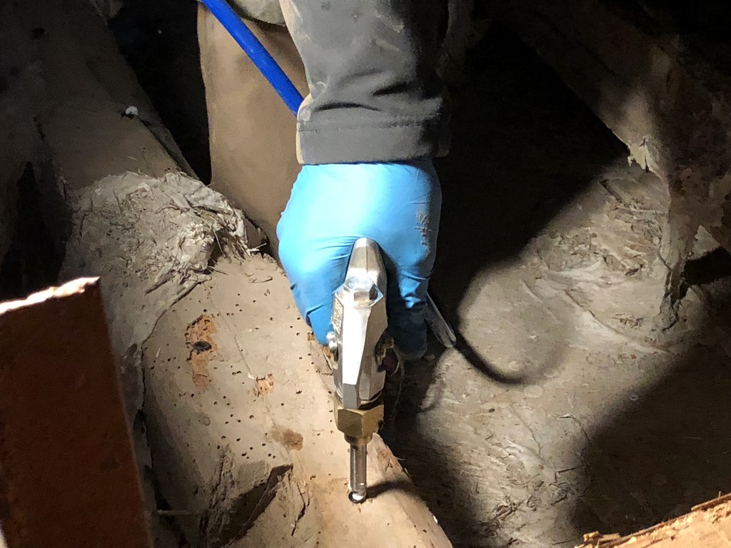 a) Inyección: Este sistema consiste en la creación de una barrera insecticida de alto poder residual en el subsuelo o en los marcos de las puertas de la instalación a proteger. Para crear dicha barrera, se procede a realizar una serie de taladros en todo el perímetro del marco retirando previamente el tapajuntas, realizando una perforación cada 20 cms, a lo largo del bastidor, colocando una válvula de no retorno e inyectando el producto insecticida al interior produciendo unas bolsas de producto que protegen al elemento de madera y que se garantiza por 5 años.